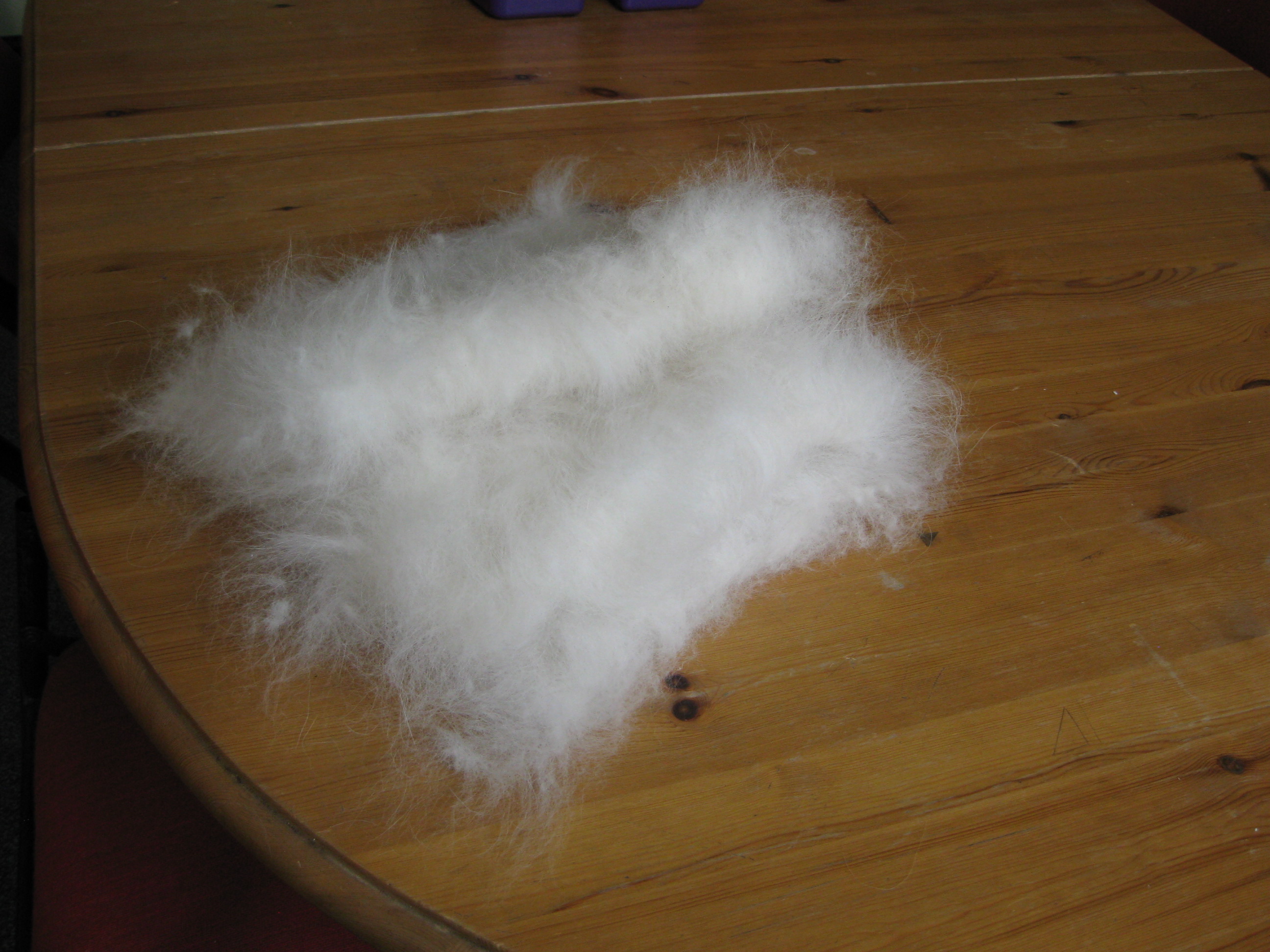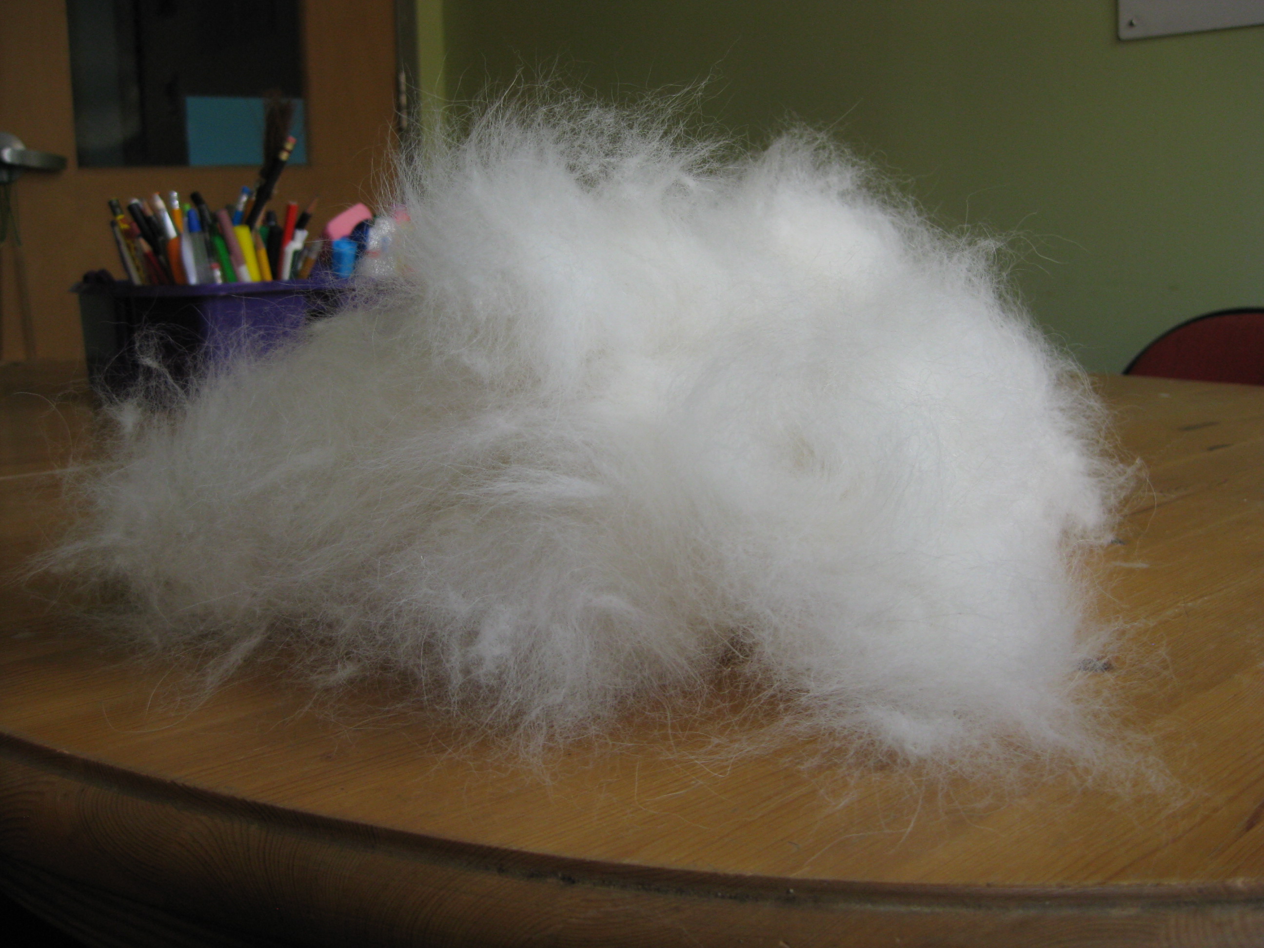 The fur is very soft and fairly clean. As you can see there are some little bits of leaves but there’s not much to pick out. I was worried this would smell strongly of dog (especially if it had to be washed first) but it wasn’t noticeable until I carded it, and even then the smell went away once I stopped handling it. If the final product is something worn it might smell doggy for a while until it’s been washed a number of times.