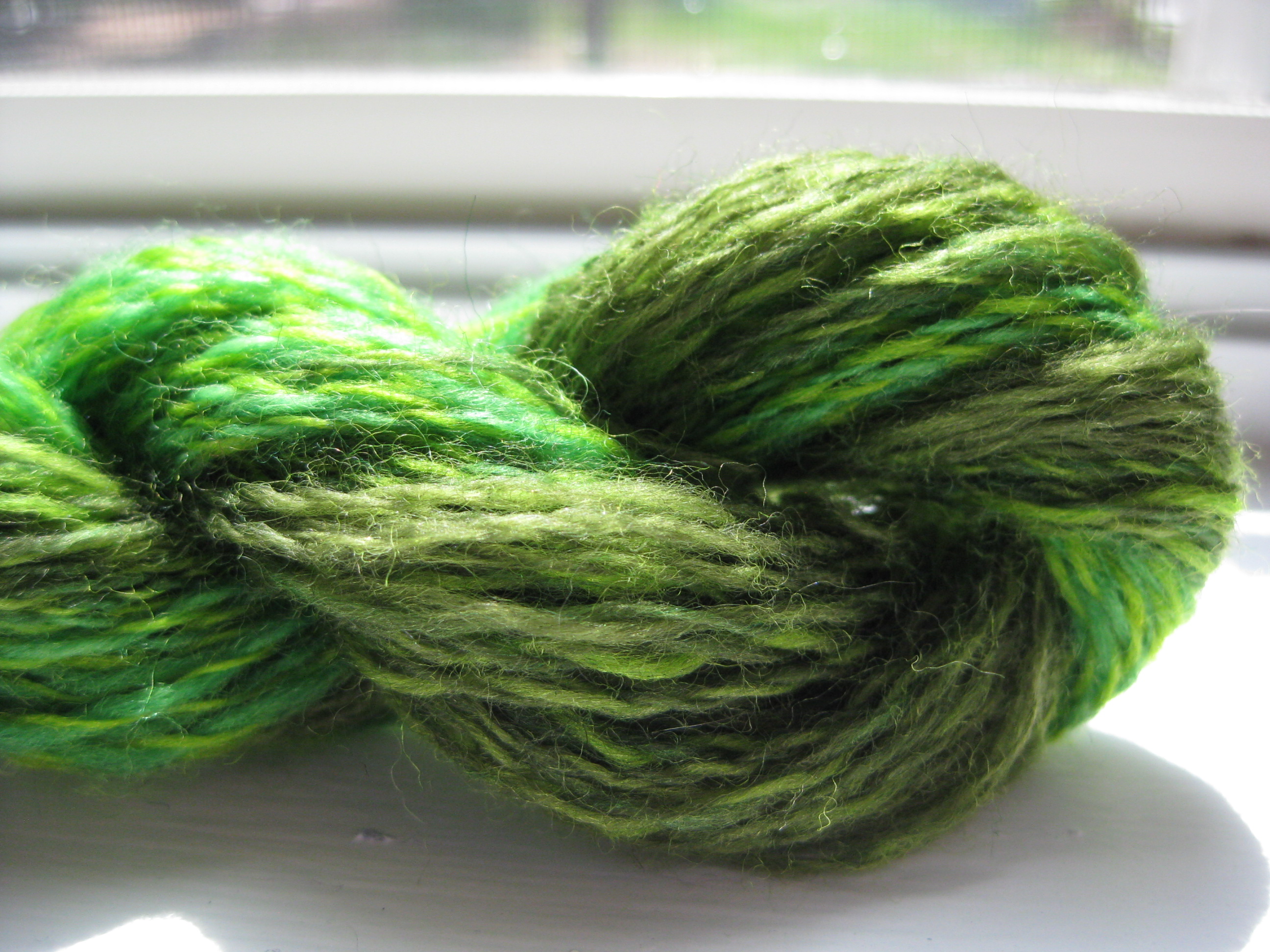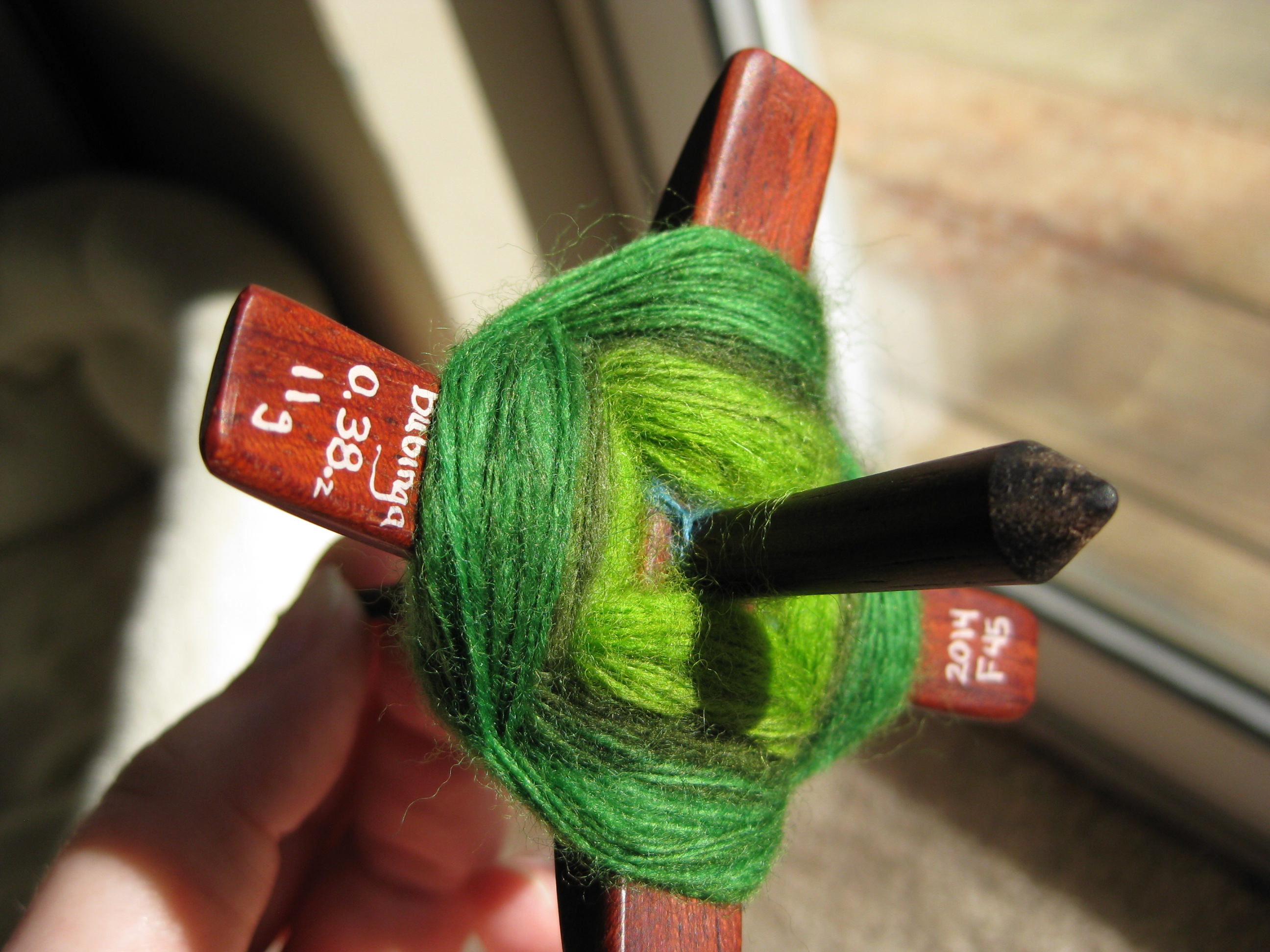 Finch’s first skein is complete! This is the Abstract Fibers in Alfalfa that came with the spindle.