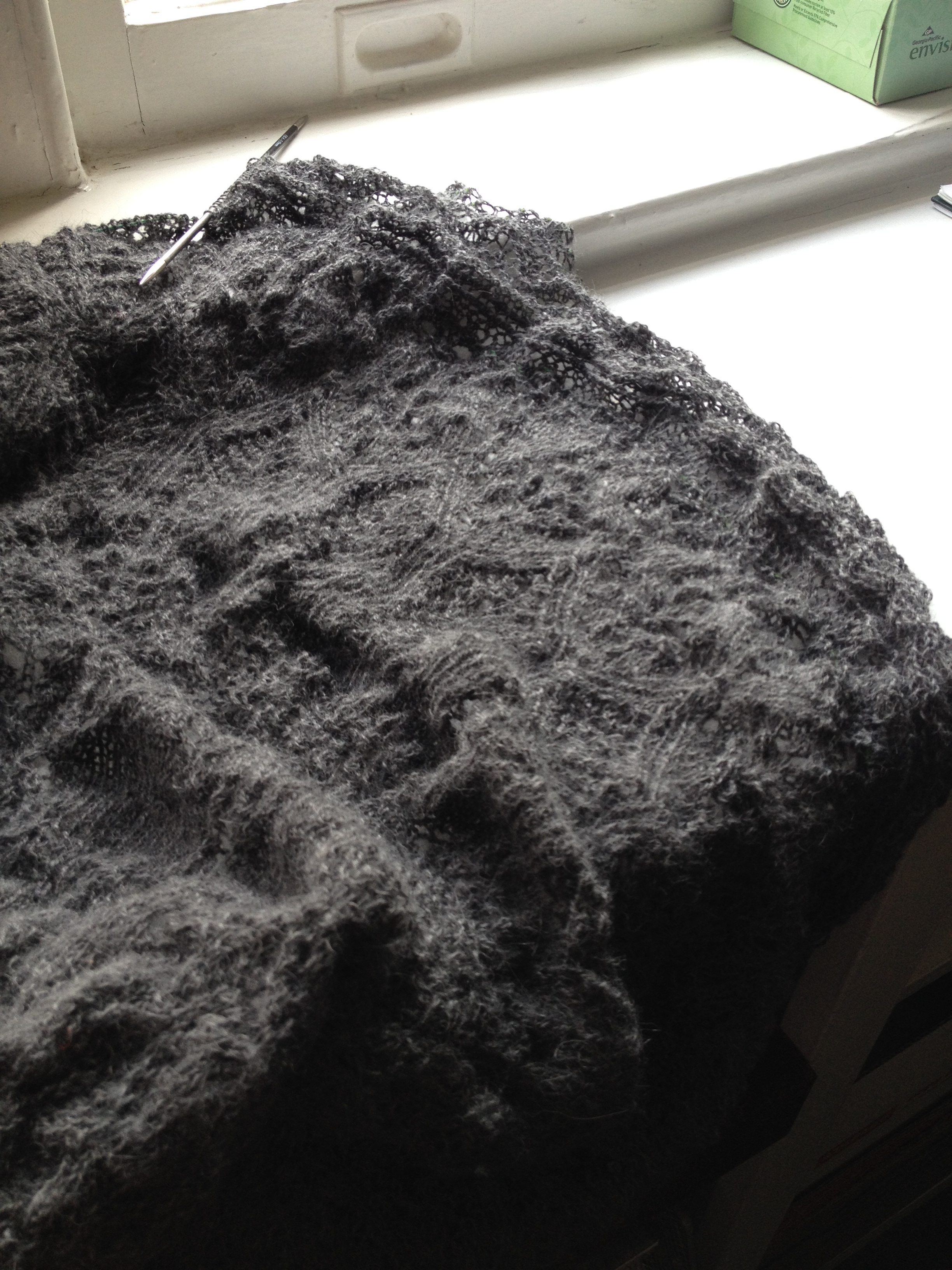 I’m just about halfway done with the edge. When I realized how busy I was going to be the beads just seemed like more work than I would be able to complete this year so I cut it down to one bead a row at the very edge (it has two knit stitches on the edge so the beads alternate). Even with this chance I’m exceedingly proud of it. This is a truly beautiful shawl.