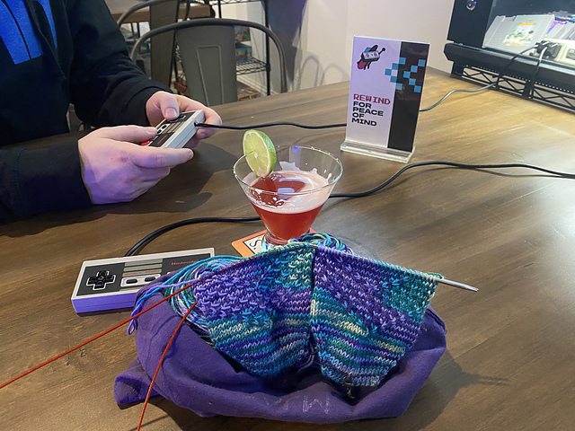 On Saturday we saw the new Super Mario Brother’s movie. It was terrible. Do not recommend. The fiancé enjoyed it more than I did but he picked up on more of the references to video game history. After that we went to a new retro bar that just opened near us called Rewind. This was the hit of the weekend. The cocktails were interesting (although I’m not much of a drinker) and there were options lots of different kinds of games. They had tons of video games but also some board games to choose from. We sat at a table with Super Mario Bro’s 3 on the original Nintendo. I was torn between knitting and playing. Knitting mostly won.