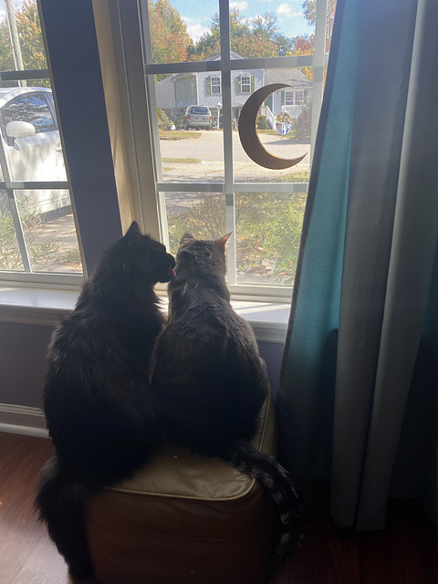 A sweet moment between the cats on the same ottoman.