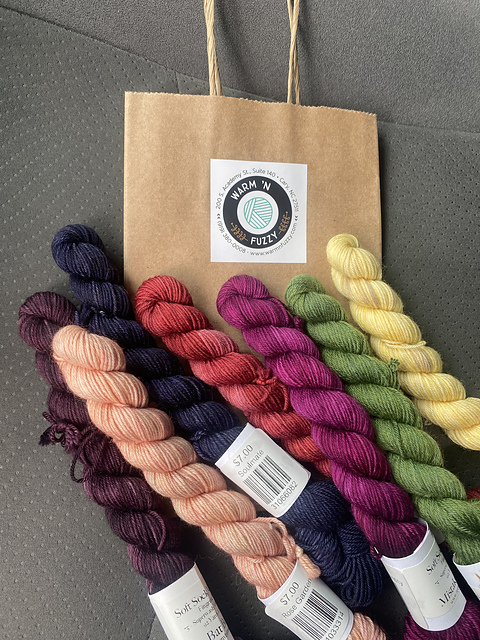 I also went by my local yarn store (Warm ‘n Fuzzy) and picked up some sock mini’s to add to my collection for the beekeeper’s quilt. It had been a terrible day so I was happy to indulge in some retail therapy. These will make some beautiful hexipuffs.