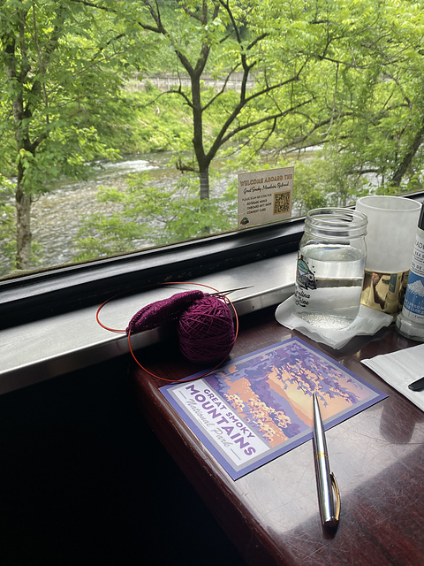 We did get to do the scenic Great Smoky Mountains Railroad moonshine tour before making the decision and we had a great time. We got to try seven moonshine flavors in total and had some yummy cheesecake on the way home. I didn’t knit as much as I expected to (it’s embarrassing how much yarn I brought for a four hour train ride) but I did get a couple rows in. I send postcards home to my family and friends while on vacation and we spent a good amount of time debating what we wanted to say while looking out over the river.