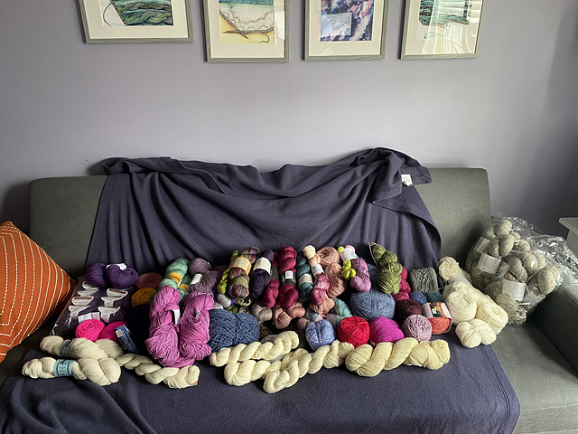 I did do some organization this week. I pulled out all my yarn onto my office couch and slowly put it all away while confirming each skein was in Ravelry. I found one that had been missed (ironically from “Forgotten Fibers”) but everything else was already properly listed. I have a lot of yarn but not so much that I feel overwhelmed by it. I’m not sure how I ended up with so much white yarn (might sell that) but the rest is dominated by cool colors (lots and lots of purple).