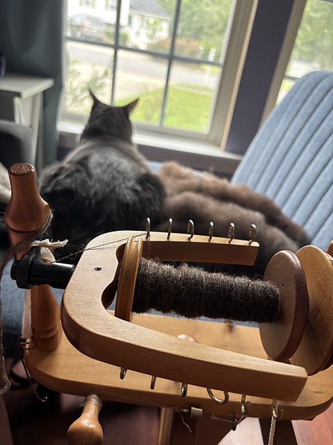 When my arms got tired of carding I switched to spinning. I’m very pleased with the yarn it’s making and can’t wait to finish. Ash was less impressed by my work and instead stole my chair to survey the world outside.