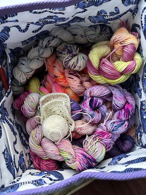 She also let me buy her stock of undyed mini’s for the project I have in mind. I’m going to crochet the Battenberg Blanket by Sandra Paul! I’m excited and slightly daunted by such a large crochet project but I’m thinking, like with the Jelly Roll blanket, the changing colors will keep me interested. I know my friend is excited to see someone else work with her hand dyed yarn as well so she’ll be a cheerleader for me. I’m waiting to start on the colors until all the advent yarn is open (one more day!) so I can get a picture of the whole collection. I did start on the white yarn and stuck them in a bag with all the yummy colors.