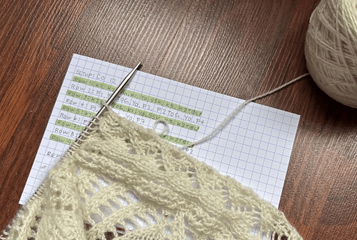 I have a lot of soft ramen yarn (which I did save just in case) but I had an extra skein found in my stash for this project so I pulled it out and wound it up. It took me quite a while to settle on a new border pattern. I had followed the edging pattern from Full Moon by Andrea Jurgrau originally so I knew that was out. I went diving on Ravelry and did find some good options but nothing that really seemed to fit. In the end, I wrote my own.