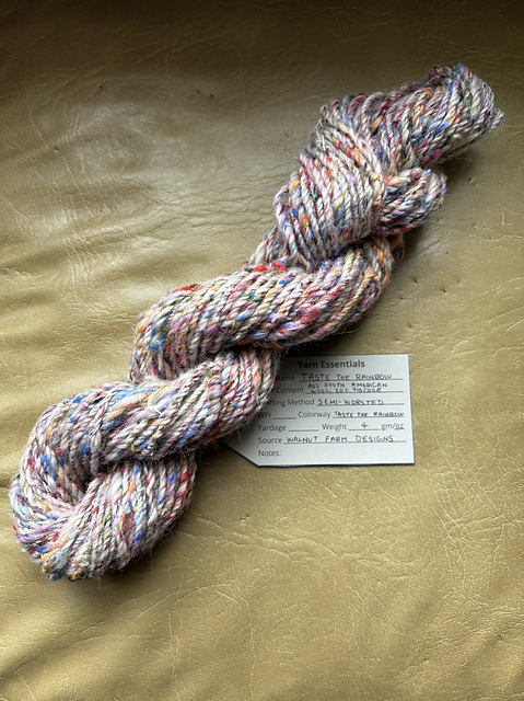 Since I’m taking a spinning class, I also needed to clear my bobbins. I ended up chain plying the Taste the Rainbow fiber I had going. I do still have some of the fiber left over (quite a lot actually) so I’ll likely spin more of it later on, but for now, the first skein is done.