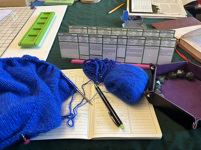 I have been slowly working on my blue Theodore Wrap. I took it to dungeons and dragons with me this past weekend and split off the sleeves. I love the beautiful color but I’m not feeling inspired or happy enough to work on it consistently. It doesn’t have to be done quickly though. Slow and steady still gets things finished.